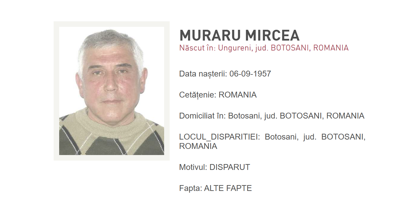 Potrivit Poliției Române, „la data de 15 aprilie 2026, lucratorii Politiei municipiului Botosani au fost sesizati prin apel SNUAU 112 de catre numita Hututui Monica despre faptul ca tata sau Muraru Mircea, de 68 ani, a plecat din data de 14 aprilie 2026, orele 10:00, de la adresa unde domiciliază fără a se mai întoarce pana in prezent”.