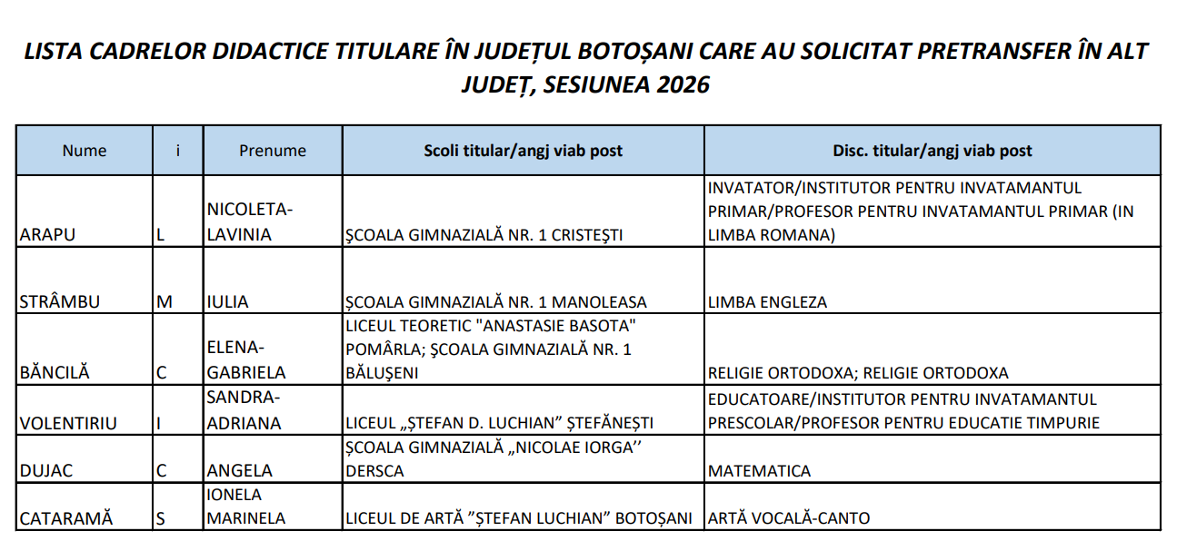 Inspectoratul Școlar Județean (ISJ) Botoșani a publicat situația cadrelor didactice titulare care solicită pretransferul prin consimțământul unităților de învățământ în alte județe. Lista cuprinde profesori din diverse cicluri de învățământ, de la educatori și învățători, până la profesori de gimnaziu și liceu. Printre disciplinele vizate se numără disciplinele fundamentale (Limba Română, Matematică), dar și specializări din ariile tehnice sau artistice.