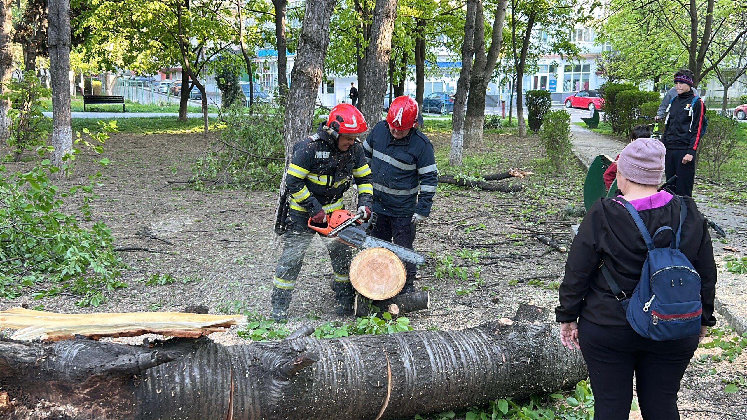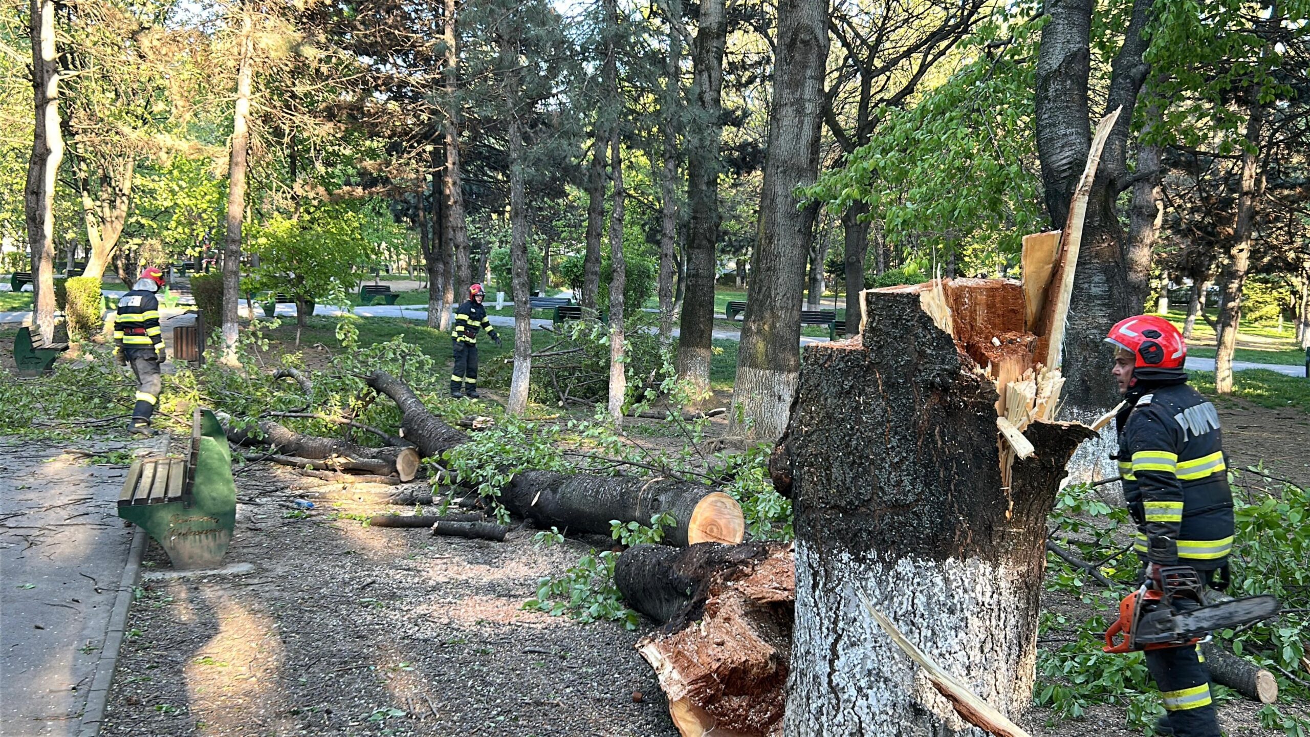 Un copac s-a prăbușit, duminică după-amiază, într-un parc din municipiul Botoșani. Pompieri au intervenit după ce un arbore gros din Parcul Curcubeului, din zona Primăverii, a fost rupt de vântul puternic.