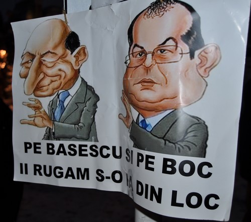 "Băsescu, nu uita, Europa nu te vrea" şi "Demisia", „Ieşi afară, javră ordinară!”, „Nu staţi la balcoane, că muriţi de foame”, au strigat oamenii.