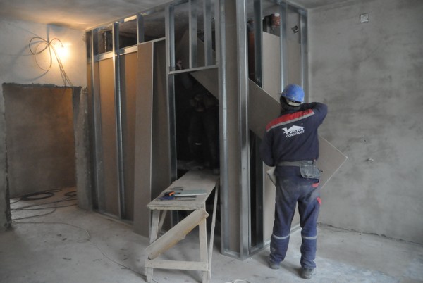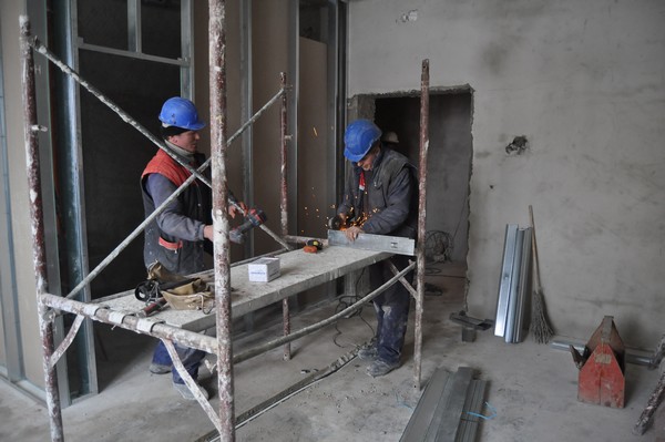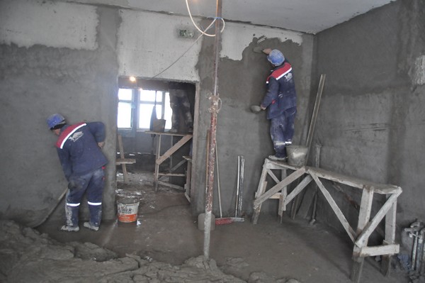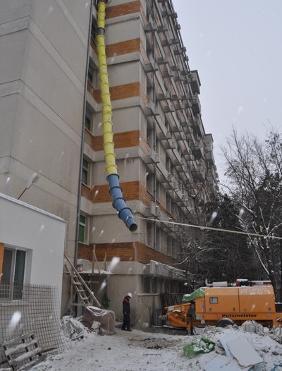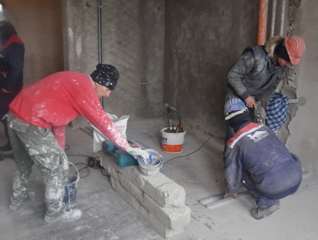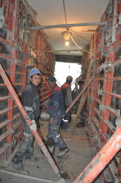 „La etajul I facem compartimentările din rigips, la etajul II se gletuieşte, la etajele VI, VII şi VIII tencuim, dăm cu şpriţ. Aşteptăm să se încălzească pentru a turna şi la etajul opt betonul pentru consolidări”, a afirmat inginerul Ioan Chideşa de la firma Victor Construct.