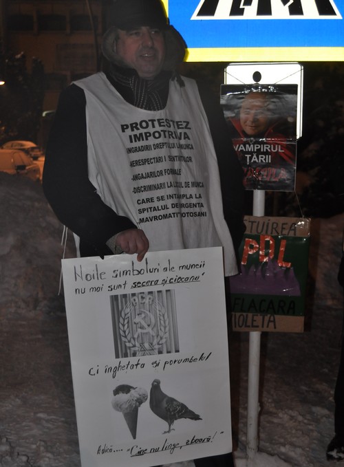 proteste 14 februarie Cei 16 oameni care au ieşit, marţi seară, în Piaţa Revoluţiei din Botoşani au ieşit din nou în evidenţă cu mesaje picante. Ei au creat un banner pe care au scris că simbolurile comuniste de pe drapelul României ar trebui să fie înlocuite cu "Îngheţata şi porumbelul" după principiile actualei guvernări care consideră că "Cine nu linge... zoboară!".