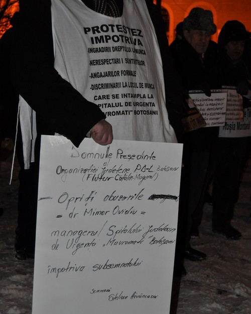 La protestele de marţi seară în centrul Botoşaniului au ieşit, ca şi până acum, liderul Sindicatului Cadrelor Militare Disponibilizate, Mircea Comăneci, şi liderul PNL Botoşani, Gheorghe Iavorenciuc.
