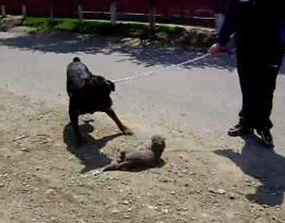 Un barbat, care pare a fi din Darabani, apare intr-un clip postat pe Youtube in timp ce isi indeamna cainele, un Rotweiller, sa omoare o pisica. Scenele sunt socante pentru ca barbatul isi tine cu o mana cainele de lesa, dar ii da cu piciorul felinei pentru a ajunge aproape de botul cainelui. In imagini se vede cum pisica incearca sa fuga, insa cainele fuge dupa ea si o insfaca cu gura.