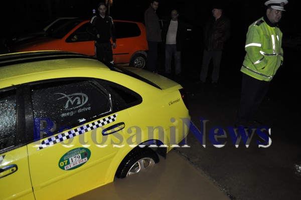 Caz incredibil pe o stradă din municipiul Botoşani. Un autoturism taxi a fost „înghiţit”, miercuri seară, de o groapă imensă în asfaltul unei străzi. Incidentul a avut loc în cartierul Alexandru Donici, unde o firmă din Suceava, care executa lucrări pentru societatea de termoficare din Botoşani, a lăsat nesemnalizat un şantier întreg. Pe fondul ploii torenţiale de miercuri seară, groapa foarte adâncă din staţia taxi din Donici a fost acoperită de apă, iar taximetristul nu a observat-o şi a intrat cu toate cele patru roţi în ea.