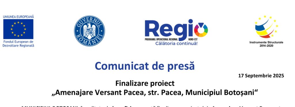 Comunicat de presă: Finalizare proiect „Amenajare Versant Pacea, str. Pacea, Municipiul Botoșani“ 17 septembrie 2025 …