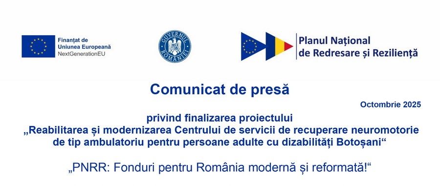 Comunicat de presă privind finalizarea proiectului „Reabilitarea și modernizarea Centrului de servicii de recuperare neuromotorie de tip ambulatoriu pentru persoane adulte cu dizabilități Botoșani“ 24 octombrie 202524 octombrie 2025 …