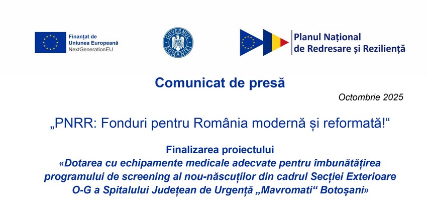 Comunicat: Finalizarea proiectului Dotarea cu echipamente medicale adecvate pentru îmbunătățirea programului de screening al nou-născuților din cadrul Secției Exterioare O-G a Spitalului Județean de Urgență „Mavromati“ Botoșani 6 octombrie 2025 …