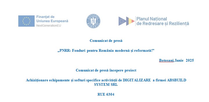 Comunicat de presă începere proiect „Achiziționare echipamente și softuri specifice activității de digitalizare a firmei ABS BUILD SYSTEM SRL 26 iunie 202526 iunie 2025 …