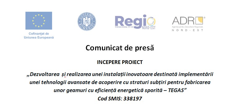 Comunicat de presă începere proiect „Dezvoltarea și realizarea unei instalații inovatoare destinată implementării unei tehnologii avansate de acoperire cu straturi subțiri pentru fabricarea unor geamuri cu eficiență energetică sporită – TEGAS” 31 iulie 2025 ….