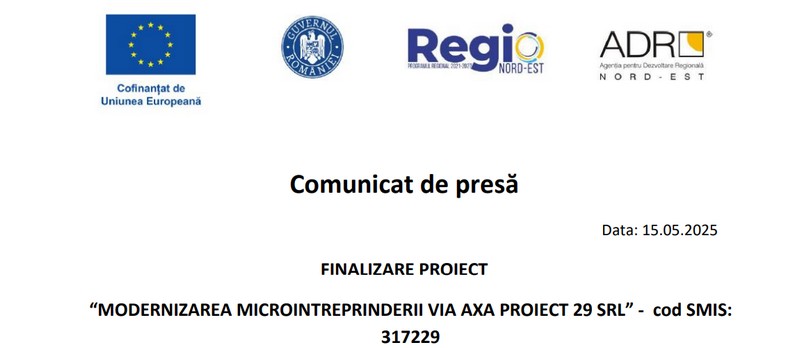 Comunicat de presă Finalizare proiect „Modernizarea microîntreprinderii Via Axa Proiect 29 SRL” 2 iulie 2025 …