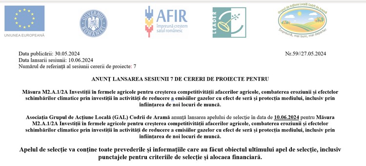 Anunţ GAL Codrii de Aramă privind lansarea seiunii 7 de cereri de proiecte pentru Măsura M2.A.1/2A 31 mai 2024 …