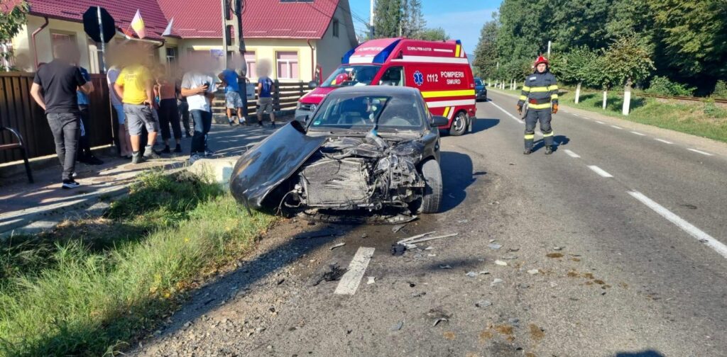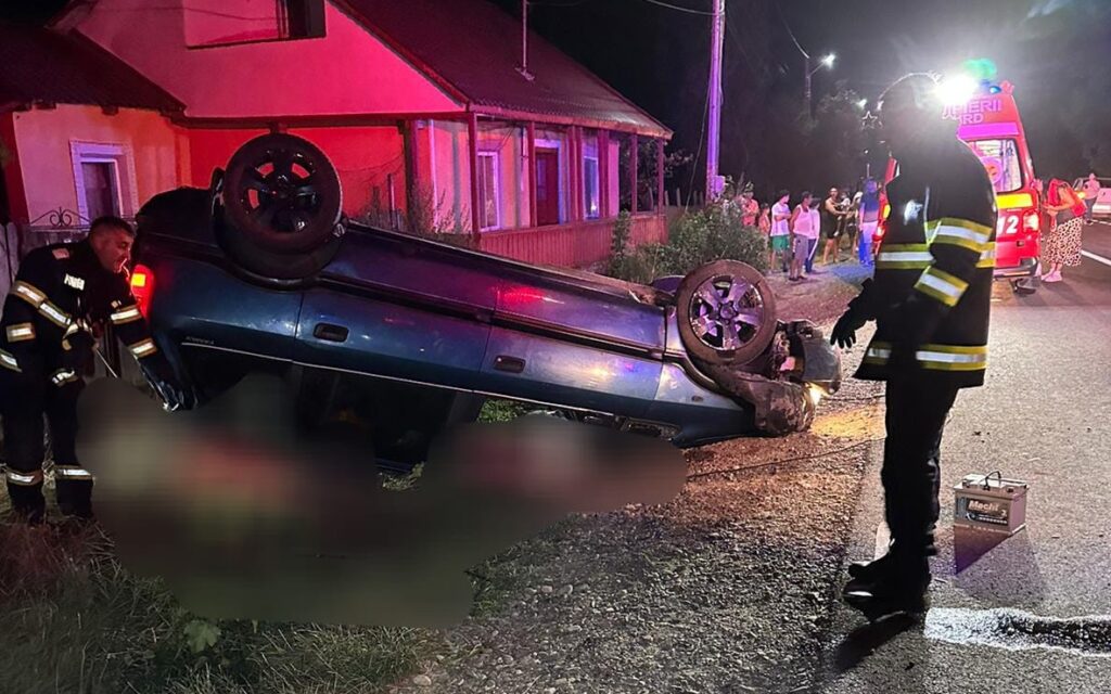 FOTO Accident pe DN 15D. Doi bărbați s-au răsturnat cu mașina, iar unul a rămas prins sub autoturism