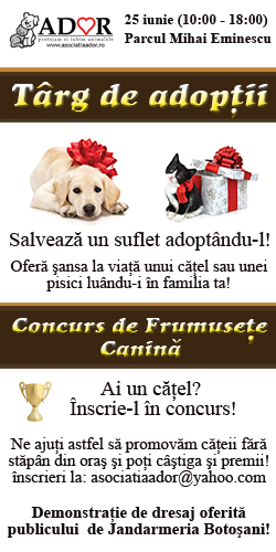 Asociaţia ADOR organizează, sâmbără, în parcul Mihai Eminescu, Târgul de Adopţii, ocazie pentru botoşănenii care iubesc animalele să salveze un căţel sau o pisică oferindu-i adăpost. Manifestarea va cuprinde şi un concurs de frumuseţe canină adresat stăpânilor de câini care îşi pot înscrie patrupedele în această săptămână. Înscrierile se fac la asociatiaador@yahoo.com. Un moment deosebit […]