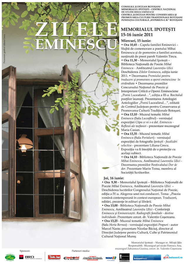 Miercuri, 15 iunie, Memorialul Ipoteşti va găzdui de la ora 11.30, cea de-a III-a ediţie a concursului naţional de poezie şi interpretare critică a operei eminesciene „Porni Luceafărul”: Evenimentul va avea loc în Amfiteatrul „Laurenţiu Ulici”, ocazie cu care vor fi decernate premiile . Evenimentul marchează practic debutul Zilelor Mihai Eminescu, ediţia de iunie. Manifestările […]