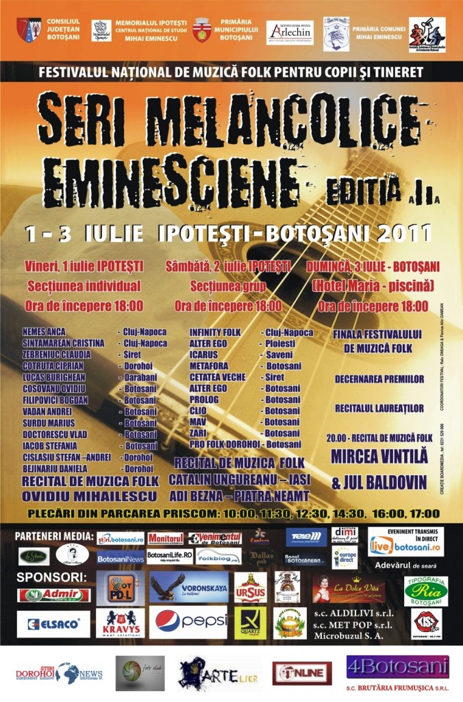 Asociaţia Judeţeană a Organizatorilor de Evenimente Botosani, Memorialul Ipoteşti – Centrul Naţional de Studii Mihai Eminescu si Societatea Culturala Arlechin Botosani, in parteneriat cu Primaria Botosani, Consiliul Judetean Botosani, Primaria Comunei Mihai Eminescu, organizeaza in zilele de 1, 2, 3 iulie 2011 a doua editie a Festivalului National de Muzica Folk pentru copii si Tineret […]