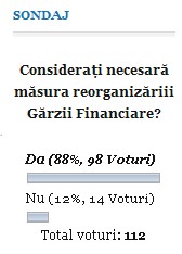 88% dintre cititorii BotosaniNews care au participat, în săptămâna 20- 26 iunie, la un sondaj de opinie pe tema reorganizării Gărzii Financiare susţin necesitatea unei astfel de măsuri. La întrebarea Consideraţi necesară măsura reorganizăriii Gărzii Financiare? au răspuns 112 persoane, iar dintre acestea 98 (88%) au răspuns afirmativ, iar 14 (12%) consideră că măsura nu […]