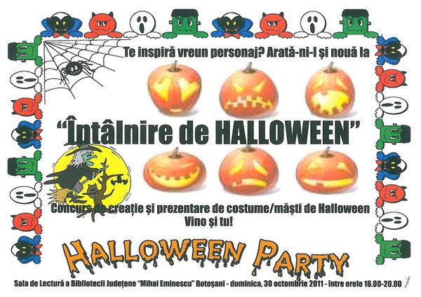 Copii cu vârstele cuprinse între 5 si 14 ani sunt invitati la: Concursul de creatie si prezentare de costume/măsti de Halloween, în cadrul Bibliotecii Judetene “Mihai Eminescu” Botosani, Duminică 30 octombrie 2011, la Sala de lectură, între orele 16-20 intr-un cadru organizat special pentru un astfel de eveniment, însotiti de profesori si părinti, se vor […]