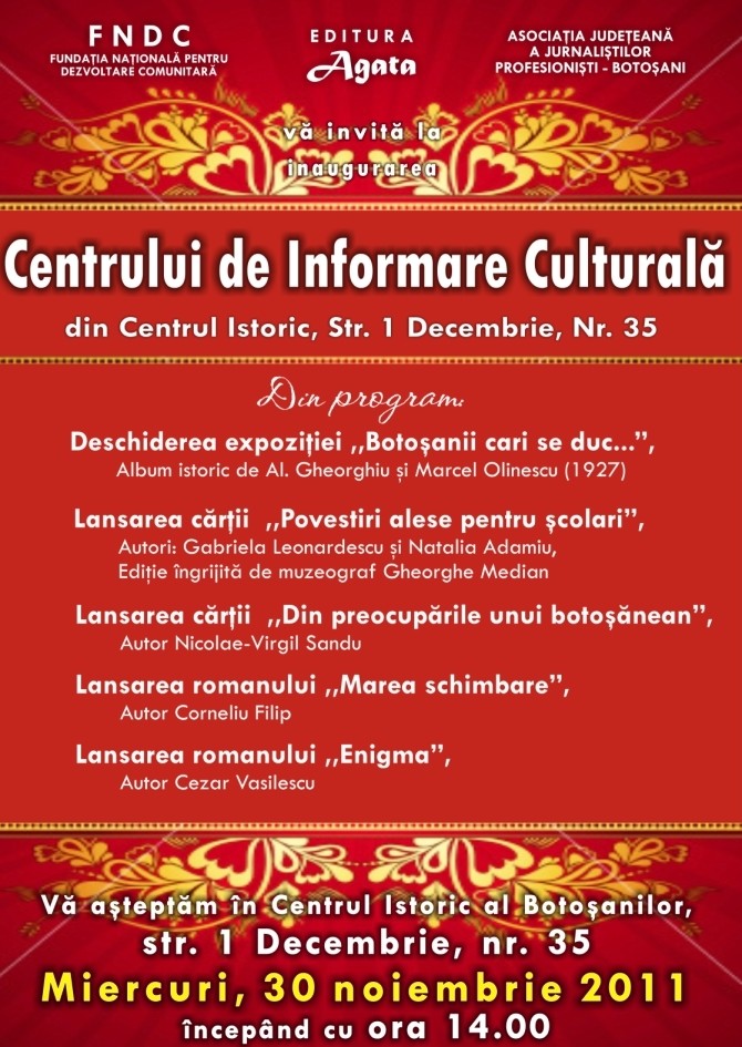 Centrul de Informare Culturală din Botoşani va fi inaugurat oficial miercuri, 30 noiembrie, începând cu ora 14.00. El va funcţiona în Centrul istoric al municipiului Botoşani, pe strada 1 Decembrie 1918, nr. 35. Evenimentul cultural este unul major şi, prin urmare, va fi marcat prin acţiuni multiple. Este vorba de vernisarea unei expoziţii, dar şi de […]