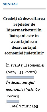 Aproape 70% dintre botoşăneni sunt de acord cu extinderea hipermarketurilor în Botoşani, potrivit unui sondaj realizat în perioada 21- 27 noiembrie de BotosaniNews. La întrebarea „Credeţi că dezvoltarea reţelelor de hipermarketuri în Botoşani este în avantajul sau dezavantajul economiei judeţului?” au răspuns 195 de persoane, dintre care 135 (69%) consideră că reţelele inernaţionale de magazine vin în […]