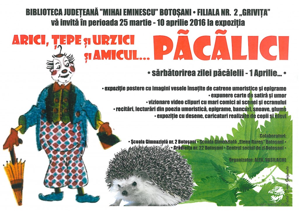 Ca în fiecare an Filiala nr. 2 „Griviţa” a Bibliotecii Judeţene „Mihai Eminescu” Botoşani ţine să-şi înveselească utilizatorii cu expoziţii şi manifestări prilejuite de 1 aprilie – Ziua păcălelilor. În cadrul evenimentelor propuse, râsul şi gluma sunt prioritare. Vor fi expuneri de carte umoristică, epigrame, snoave, bancuri, comedii, vizionări de videoclipuri cu scene comice, recitări […]