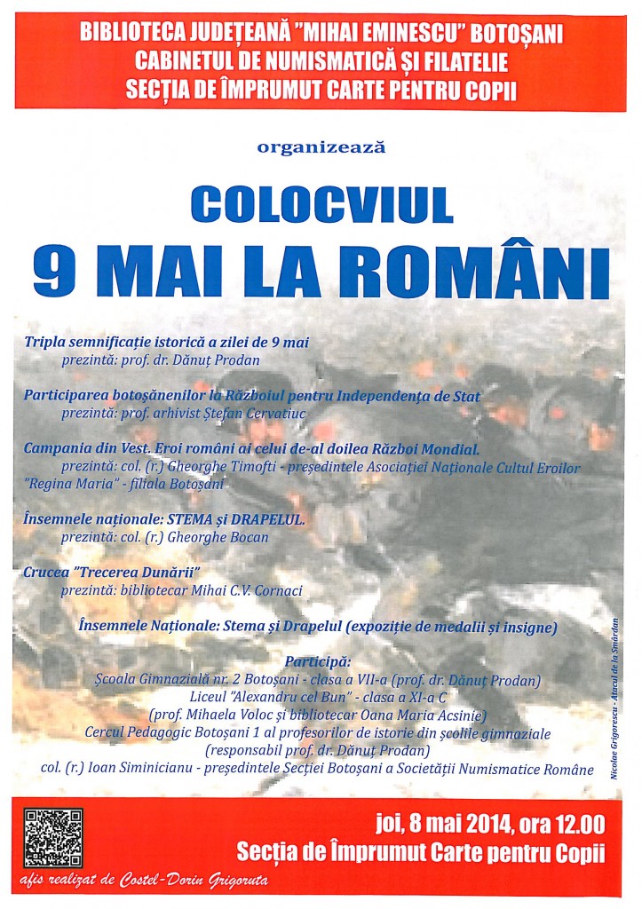 Muzeul Judeţean Botoşani organizează joi 8 mai 2014, ora 13.00, în Sala Mare a Muzeului de Istorie Botoşani, simpozionul şi vernisajul expoziţiei „9 Mai şi valenţele sale istorice”. Vor susţine intervenţii: Sergiu Balanovici, Dan Prodan, Gheorghe-Florin Ştirbăţ. Participă, cu exponate tematice de filatelie şi numismatică: Gheorghe Bocan, Coriolan Chiricheş, Mihai Cornaci, Gică Mariţanu. Manifestările vor […]
