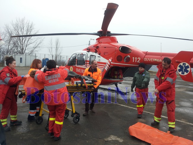 O femeie,de 48 de ani, aflată în stare gravă a fost transportată, miercuri după amiază, în stare gravă la Iaşi. Medicii botoşăneni au solicitat intervenţia elicopterului SMURD pentru ca Adriana Şalaru să ajungă la o clinică din Iaşi. Femeia a suferit un accident vascular şi nu putea fi transportată cu ambulanţa terestră.