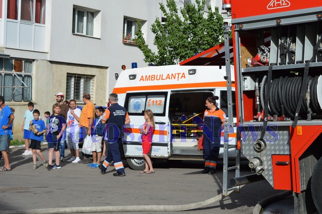 Femeie luată cu ambulanţă din blocul cuprins de flăcări