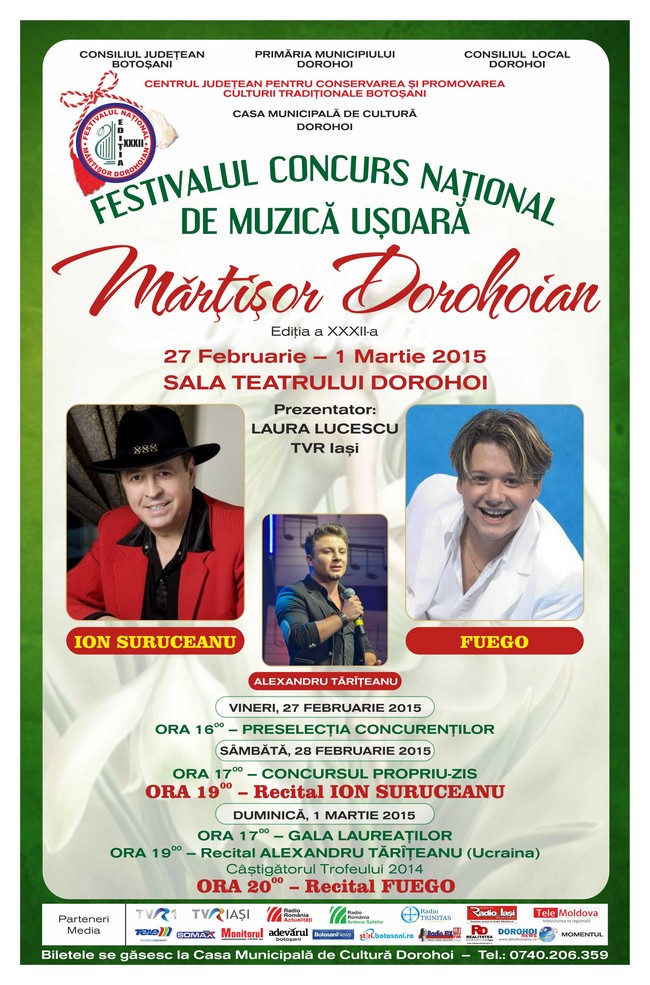 Cea de-a 32-a ediție a Festivalului Național de Muzică Ușoară Mărțișor Dorohoian va începe, sâmbătă, la Dorohoi. Preselecția pentru concurenți va avea loc, vineri, la Casa Municipală de Cultură din localitate, începând cu ora 16.00. Evenimentul va fi prezentat de realizatoarea de la TVR Iași, Laura Lucescu. Concursul este organizat, ca anul trecut, pe două […]