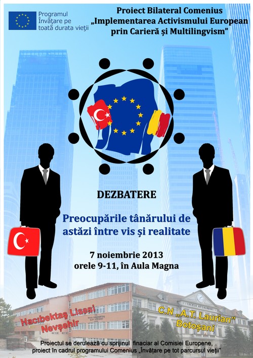 Joi, în Aula Magna a C.N.”A.T.Laurian”, are loc deschiderea oficială a Proiectului Bilateral Comenius, Implementarea activismului european prin carieră și multilingvism , proiect derulat cu sprijinul financiar al Comisiei Europene prin Programului de Învățare pe tot parcursul vieții. Dezbaterea „Preocupările tânărului între vis și realitate” va reuni joi, ora 9:00, în Aula Magna a liceului, elevi, […]