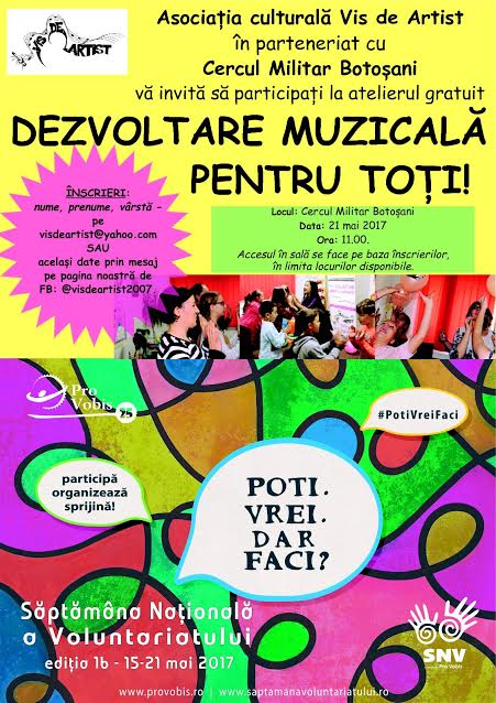 În fiecare an, Asociația culturală Vis de Artist Botoșani sărbătorește Săptămâna Națională a Voluntariatului (SNV). SNV este un eveniment național anual, preluat din experiența altor țări și inițiat în România în 2002 de către Pro Vobis, care gestionează la nivel național derularea acestuia. Evenimentul este realizat pentru a promova conceptul și practica voluntariatului, pentru a […]