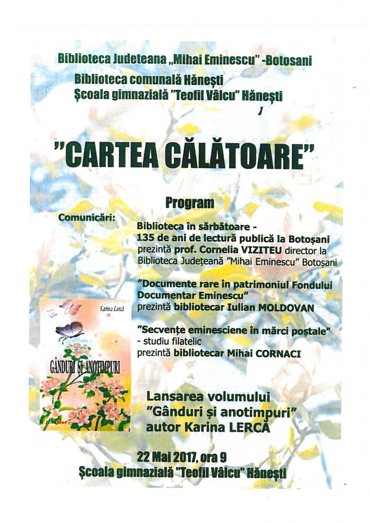 Biblioteca Județeană „Mihai Eminescu” – Botoșani și Cenaclul literar „Luceafărul” al Bibliotecii Comunale Hănești, vă invită să fiți martorii unui eveniment încântător. Unul dintre membrii cenaclului literar „Luceafărul”, eleva Karina Lercă, uimește publicul consumator de literatură lansând, la numai 12 ani, primul său volum de versuri, intitulat „Gânduri și anotimpuri” și apărut la Editura Ștef, […]
