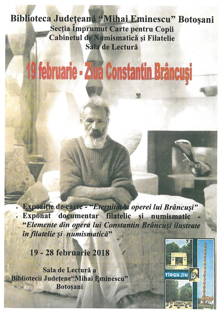 Biblioteca Judeţeană „Mihai Eminescu” Botoşani îşi propune să continue seria aniversărilor-comemorărilor aşezate sub auspiciile anului aniversar 2018 prin celebrarea naşterii marelui sculptor Constantin Brâncuşi, în cadrul activităţii „19 februarie – Ziua Constantin Brâncuşi ”. De altfel, 19 februarie (ziua naşterii sculptorului român Constantin Brâncuşi) a fost declarată zi de sărbătoare naţională, potrivit Legii nr. 305/2015 privind […]