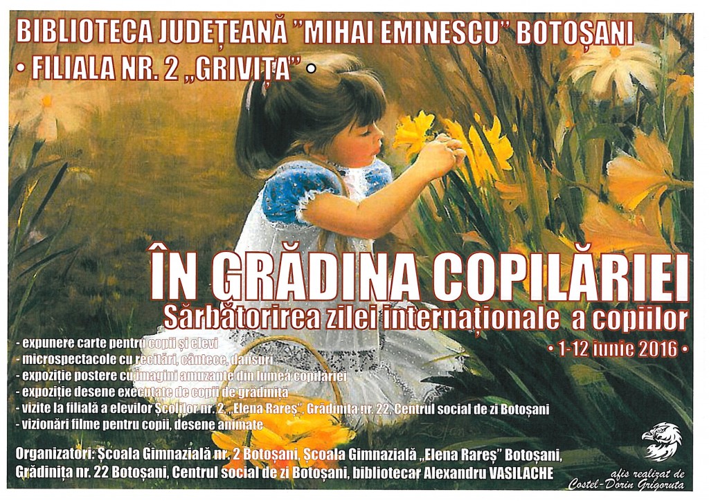 Biblioteca Județeană „Mihai Eminescu” Botoșani, prin Secția de Împrumut Carte pentru Copii organizează în perioada 20 martie – 3 aprilie 2017 concursul „Lumea cărţilor prin desen şi creaţie literară ”. Manifestarea este prilejuită de aniversarea Zilei Internaţionale a Cărţii pentru Copii şi Tineret – 2 aprilie 2017. Concursul se va derula potrivit prevederilor acestui regulament, pe […]