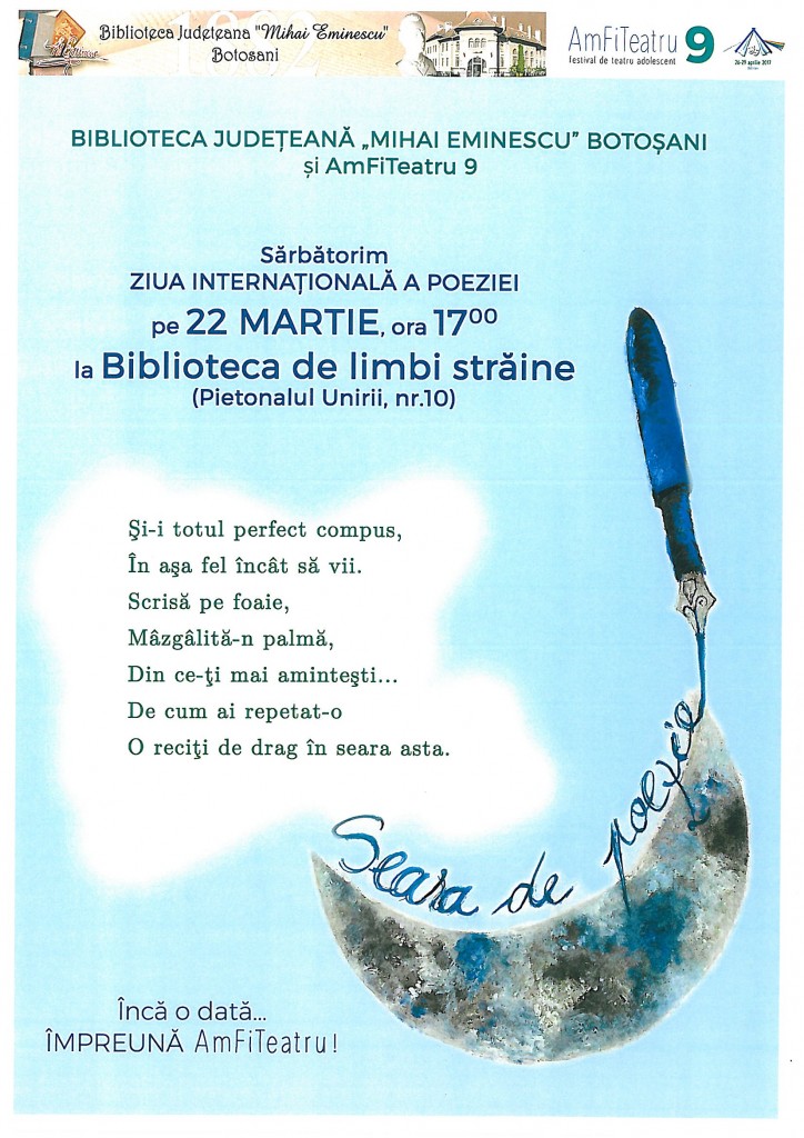 Biblioteca Judeţeană “Mihai Eminescu” Botoşani, împreuna cu Asociaţia AmFiTeatru 9, vă invită la o „Seară de Poezie”, prilejuită de Ziua Internaţională a Poeziei. Acest moment poetic se adresează tuturor iubitorilor de frumos. În cadrul acestei activităţi, parte a proiectului AmFiTeatru 9 – Festival de teatru adolescent ( 26 – 29 aprilie 2017) va avea loc şi […]