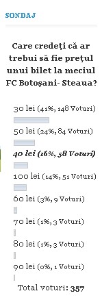 Sondaj! Trei sferturi dintre botoşăneni sunt de părere că biletul la meciul cu Steaua nu trebuie să fie mai mare de 50 de lei