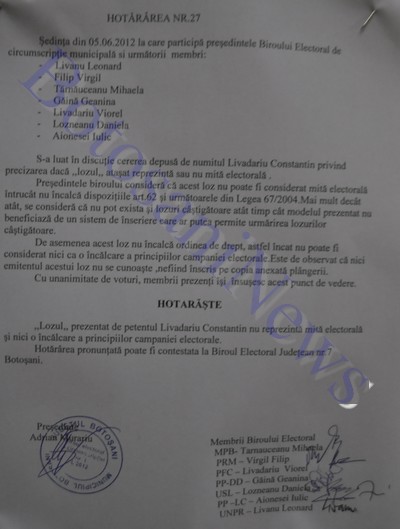 Un bărbat din Botoşani a reclamat la Biroul Electoral de Circumscripţie lozurile electoral oferite în campania electorală de USL. Constantin Livadariu a solicitat BEC să se pronunţe dacă acel loz este sau nu mită electorală. După analizarea cererii, reprezentanţii BEC au considerat că lozul nu reprezintă mită electorală. „Se consideră că nu pot exista şi […]