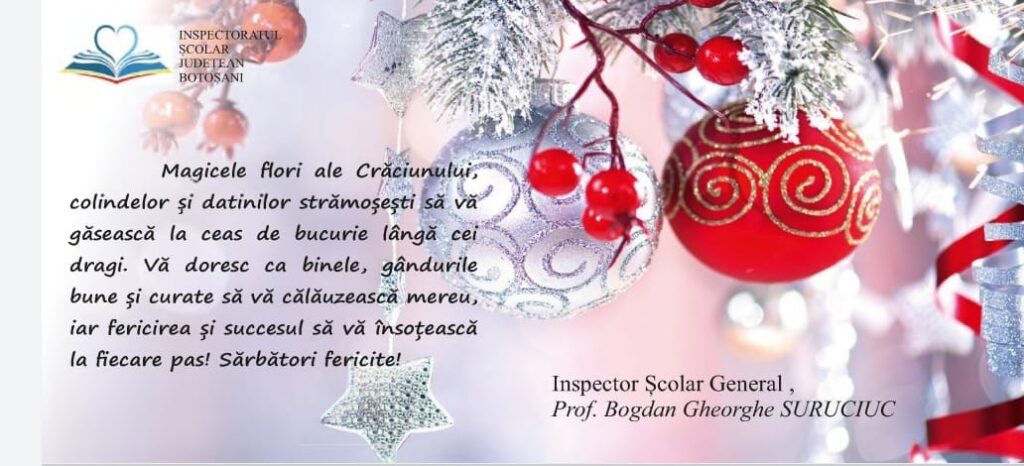 Șeful Inspectoratului Școlar, Bogdan Suruciuc: Magicele flori ale Crăciunului, colindelor și datinelor strămoșești să vă găsească la ceas de bucurie lângă cei dragi! Sărbători fericite! 23 decembrie 202223 decembrie 2022 …