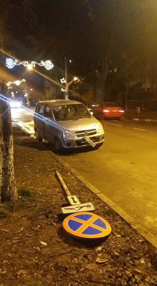 FOTO Un şofer beat a urcat cu mașina pe bordură și a rupt un indicator rutier