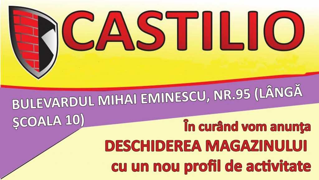 Pe 20 februarie, începând de la ora 08:00, Castilio va inaugura magazinul din Bulevardul Mihai Eminescu, nr.95, de lângă Şcoala 10. Reprofilarea magazinului Castilio, din obiecte sanitare într-o gamă variată de produse, de la varuri lavabile albe şi colorate, vopsele şi lacuri, scule şi accesorii de zugrăvit la galerii de lemn şi metal, şine de […]