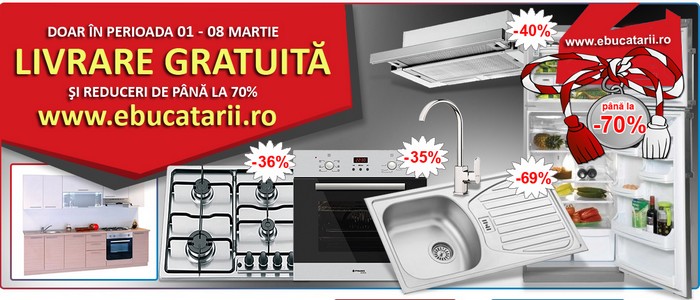 Castilio iţi oferă un marţisor în perioada 1-8 martie pe site-ul www.ebucatarii.ro: livrare gratuită în toată ţara şi reduceri de până la 70% la electrocasnicele de bucătărie. Printre promoţiile pe care le regăsiţi pe site-ul www.ebucatarii.ro, se numără: • Chiuveta de bucătarie din inox Pyramis Derby (-69%), de la 642,35 lei la doar 199,99 lei; […]