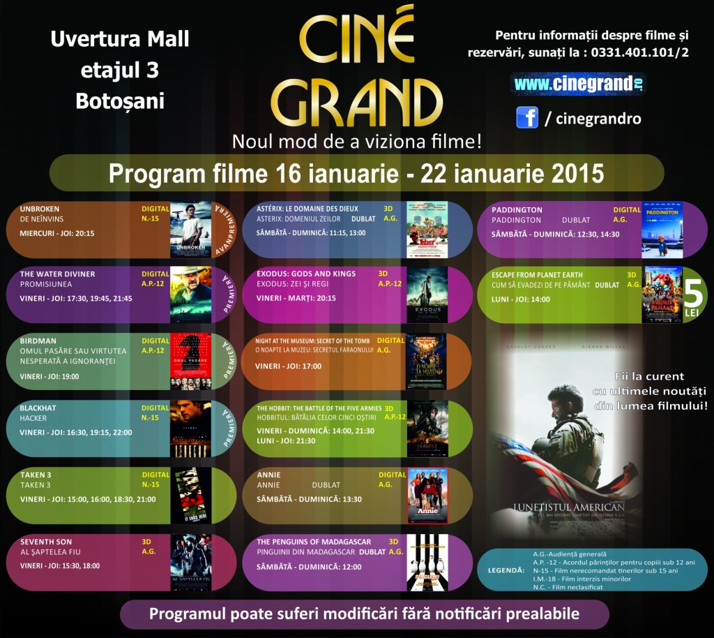 Cine Grand prezintă un program deosebit de filme în următoarea săptămână. Botoşănenii sunt aşteptaţi să vizioneze de la drame, comedii, animaţii până la SF. Blackhat este una dintre producţiile vedetă ce rulează pe marile ecrane. Producţia spune povestea unui celebru hacker, condamnat la închisoare, şi care ajunge să colaboreze cu autorităţile pentru a prinde un […]