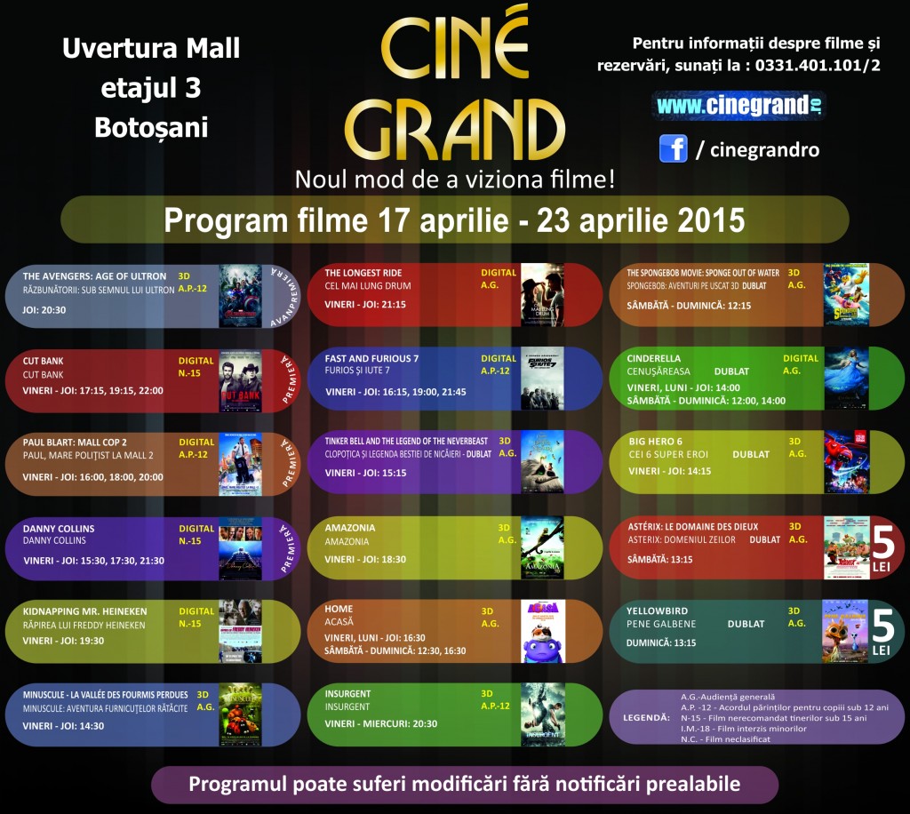 Iubitorii de film din Botoşani au o gamă variată de producţii în săptămâna 17-23 aprilie la CineGrand. Cinematograful pune la dispoziţia clienţilor 17 filme, de la comedii şi acţiune până la animaţii. Paul, Marele poliţist la Mall 2 este una dintre cele mai îndrăgite comedii lansate în acest an. Fast and Furios 7 continuă să […]