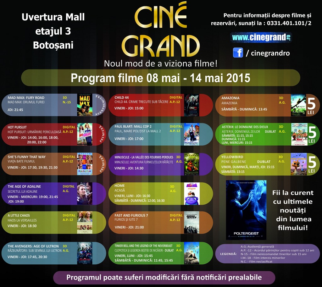 Cinematograful CineGrand a lansat noua ofertă pentru săptămâna 8-14 mai. Nu mai puţin de 15 filme îi aşteaptă pe botoşăneni. Vedeta săptămânii este producţia „Mad Max Fury Road”. Urmărit de un trecut turbulent, Mad Max prefera să călătorescă de unul singur şi să nu işi facă prieteni. În ciuda convingerilor sale, se alătură unui grup de […]