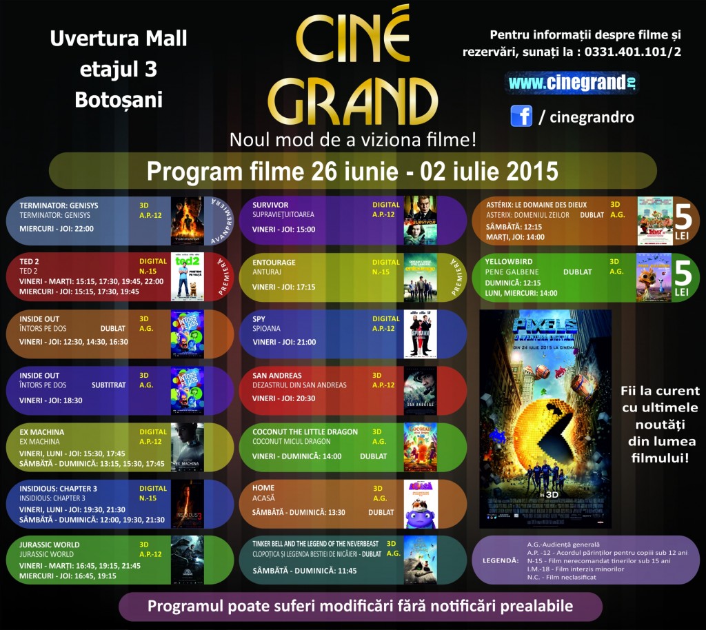 Cinematograful multiplex Cine Grand din Uvertura Mall va pune, în perioada 20- 26 septembrie, la dispoziţia pasionaţilor de film din Botoşani şi Suceava nu mai puţin de 20 de producţii în format 3 D sau digital. Iată programul celor 20 de filme: Friday Saturday Sunday Monday Tuesday Wednesday Thursday Screen Movie Title Format 20.09.2013 […]