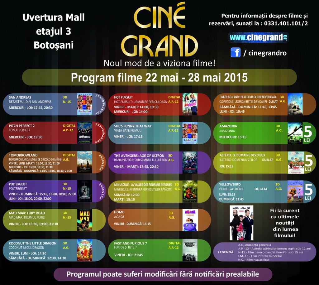 Cine Grand vine cu o nouă ofertă pentru iubitorii de film. Cinematograful din incinta mall-ului din Botoşani propune pentru următoarea săptămână un program spectaculos de producţii. The Avengers: Age of Ultron este unul dintre filmele aşteptate după ce prima parte a seriei a făcut furori printre iubitorii de super-eroi. Child 44 este o altă producţie propuse […]