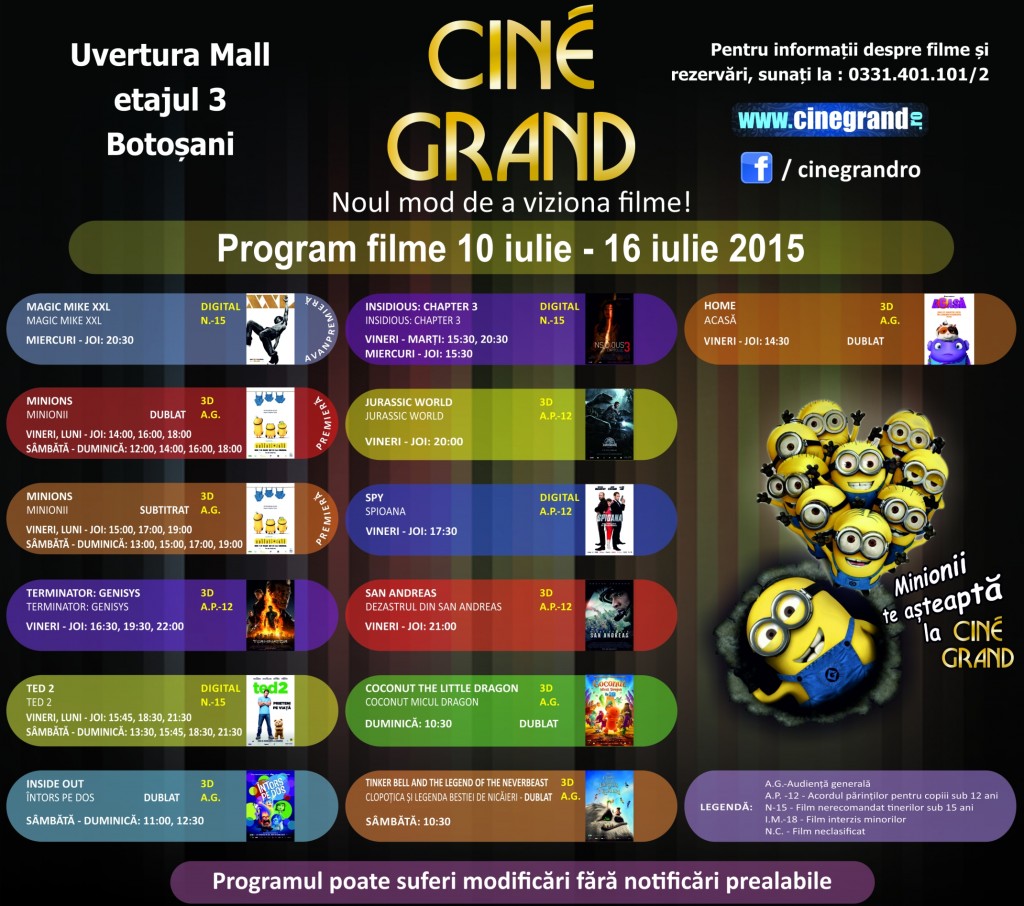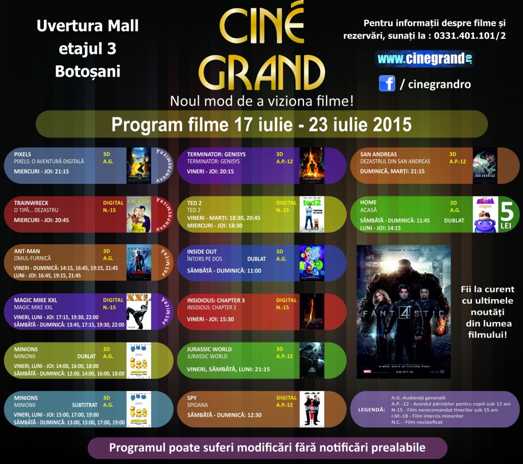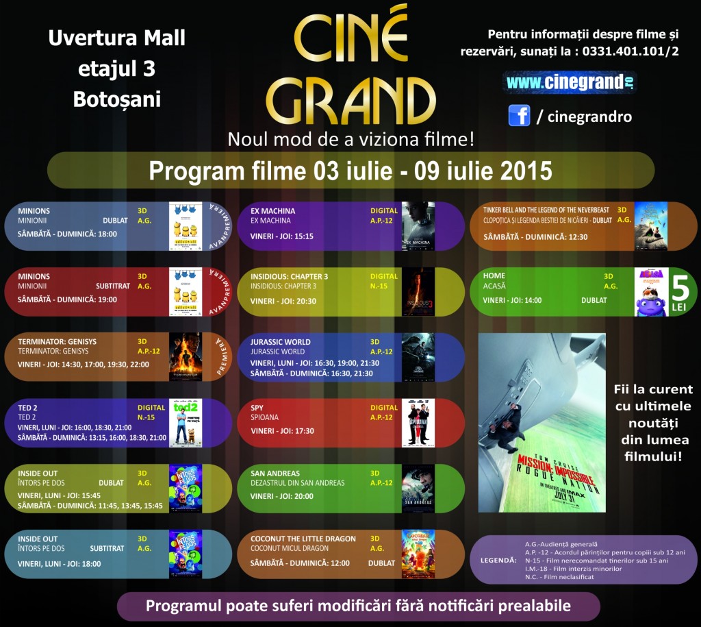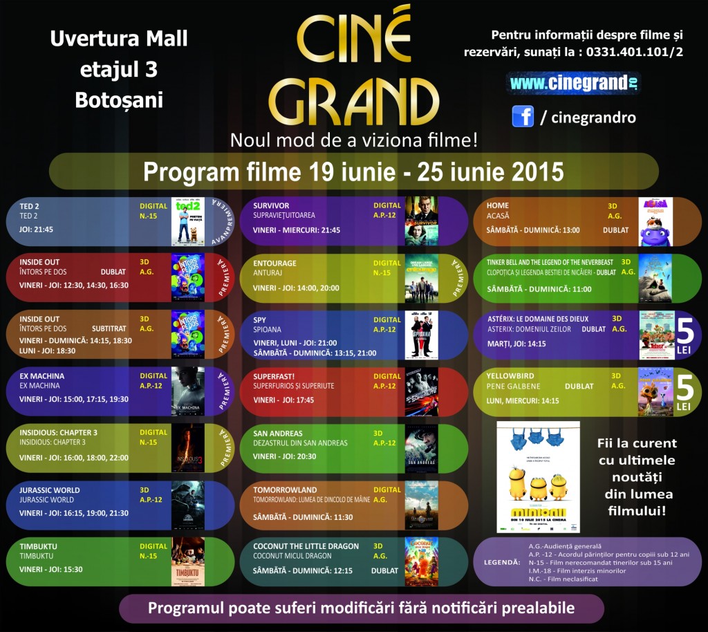 CineGrand oferă botoşănenilor 18 producţii cinematografe în această săptămână. SF, acţiune, dramă, comedie şi animaţie îi aşteaptă pe iubitorii de film. Ex Machina, Insidious Chapter 3, Timbuktu, Jurassic World, Survivor, Entourage, Phoenix, Spy, Superfast sau San Andreas sunt doar câteva dintre producţiile ce sunt rulate de cinematograf.
