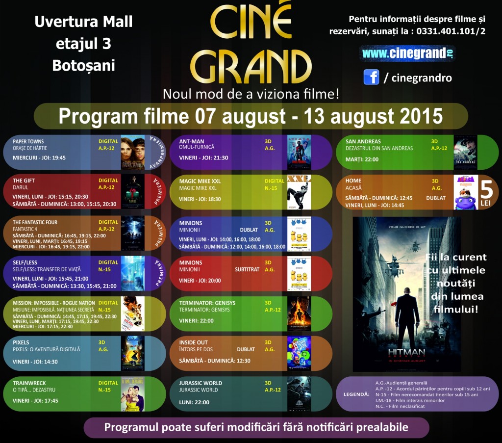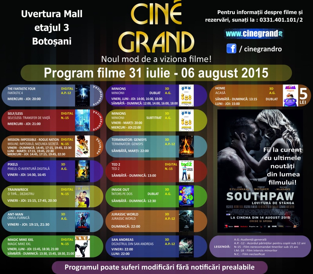 CineGrand a lansat o nouă oferte de filme pentru botoşăneni şi nu numai. Cinematograful din incinta mall-ului pune la dispoziţia iubitorilor de film 14 producţii. Noutăţile propuse de CineGrand sunt Omul furnică. Înarmat cu o abilitatea extraordinară de a-şi micşora dimensiunea şi de a-şi mări proporţional puterea, escrocul Scott Lang (Paul Rudd) se vede nevoit să […]
