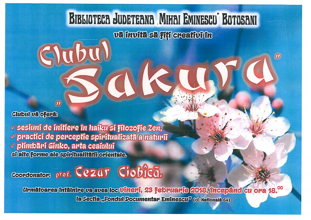 Biblioteca Județeană „Mihai Eminescu” – Botoșani vă propune, începând cu această săptămână, o modalitate inedită de petrecere a timpului liber. Este vorba despre prima întâlnire a Clubului „Sakura”, care vă oferă inițiere în artele, cultura și filosofia orientală. Prima întrunire a clubului are loc vineri, 9 februarie 2018, ora 14:00, la Secţia “Fondul Documentar Eminescu”, din […]