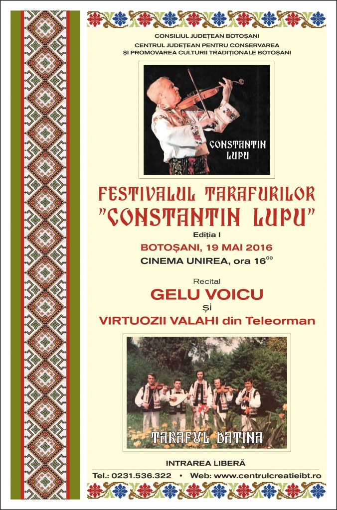 Centrul Judeţean pentru Conservarea şi Promovarea Culturii Tradiţionale Botoşani, instituţie de cultură aflată sub patronajul Consiliului Judeţean Botoşani, organizează FESTIVALUL TARAFURILOR “CONSTANTIN LUPU”. Acţiunea culturală aflată la prima ediţie va avea loc joi 19 mai 2016 în Municipiul Botoşani, Pietonalul Unirii, în faţa Cinematografului Unirea cu începere de la ora 16.00. Vor oferi spectacole tarafuri […]